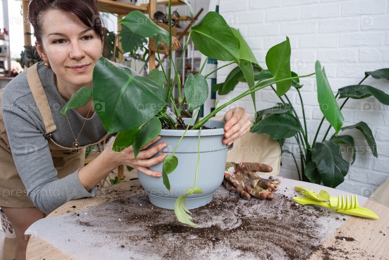 Пересадка домашнего растения Philodendron Monstera deliciosa в новый горшок в интерьере дома.Уход за растением в горшке, руки крупным планом