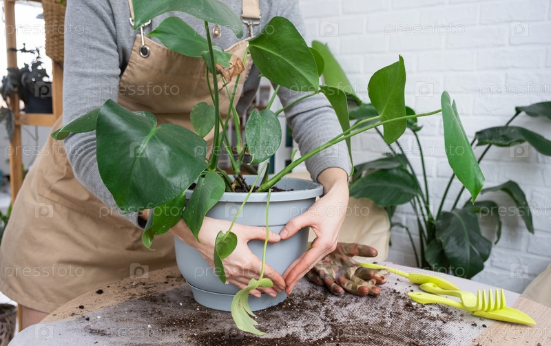 Пересадка домашнего растения Philodendron Monstera deliciosa в новый горшок в интерьере дома.Уход за растением в горшке, руки крупным планом