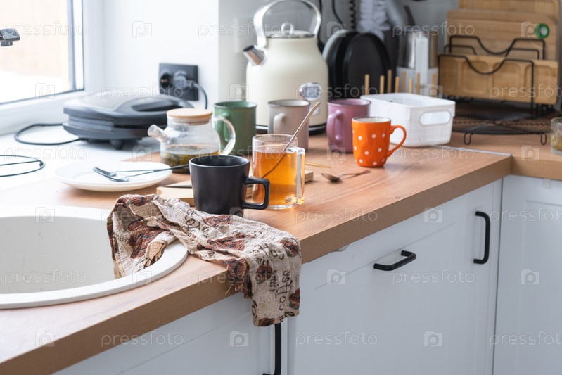 Беспорядок на кухне, грязная посуда на столе, разбросанные вещи, антисанитария. Посудомойка полная, кухня в беспорядке, будни