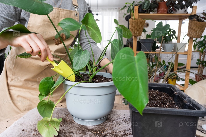 Пересадка домашнего растения Philodendron Monstera deliciosa в новый горшок в интерьере дома.Уход за растением в горшке, руки крупным планом