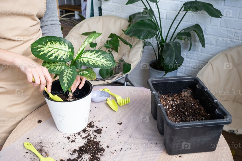 Пересадка домашнего растения Диффенбахия Тропик Сноу в новый горшок в домашних условиях в двойной горшок с автоматическим поливом. Уход за растением в горшке, крупный план