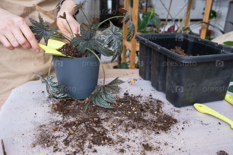 Пересадка домашнего растения Бегония Грифон в новый горшок. Женщина сажает стебель с корнями в новую почву. Уход за растением в горшке, руки крупным планом