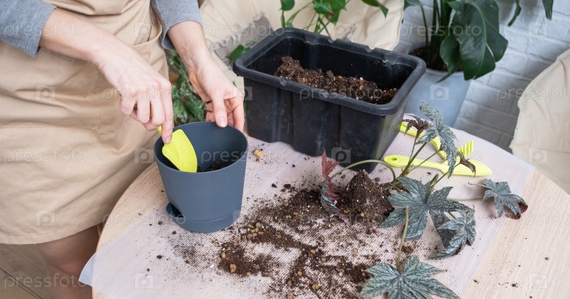 Пересадка домашнего растения Бегония Грифон в новый горшок. Женщина сажает стебель с корнями в новую почву. Уход за растением в горшке, руки крупным планом