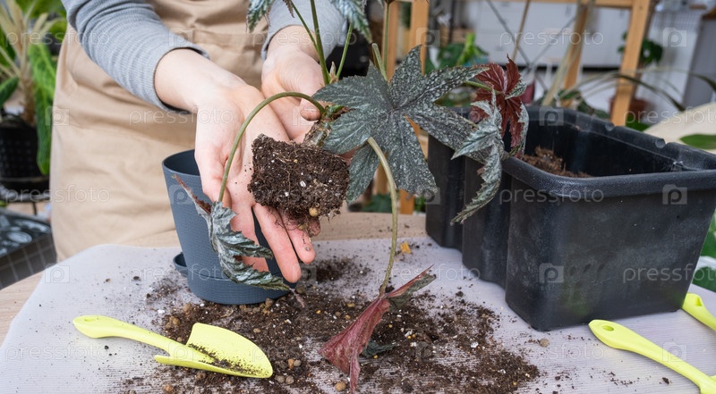 Пересадка домашнего растения Бегония Грифон в новый горшок. Женщина сажает стебель с корнями в новую почву. Уход за растением в горшке, руки крупным планом