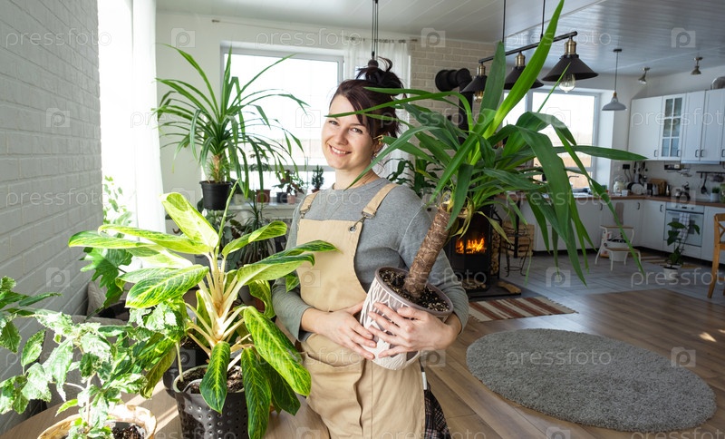 Счастливая женщина в зеленом доме с растением в горшке в руках улыбается, ухаживает за цветком. Интерьер уютного экологичного дома, каминная печь, хобби по выращиванию и разведению комнатных растений