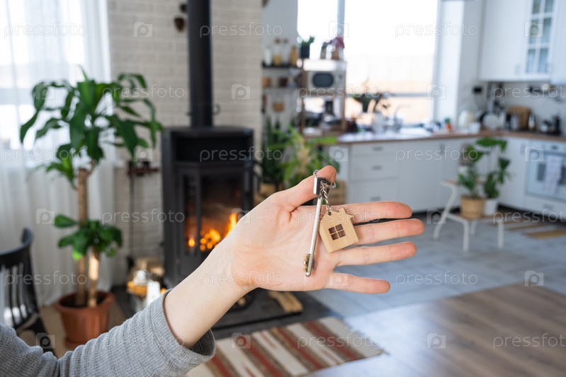 Ключ от дома с брелком на фоне каминной печи с огнем и дровами. Уютный домашний очаг. Строительство, дизайн, проект, переезд в новый дом, ипотека, аренда и покупка недвижимости
