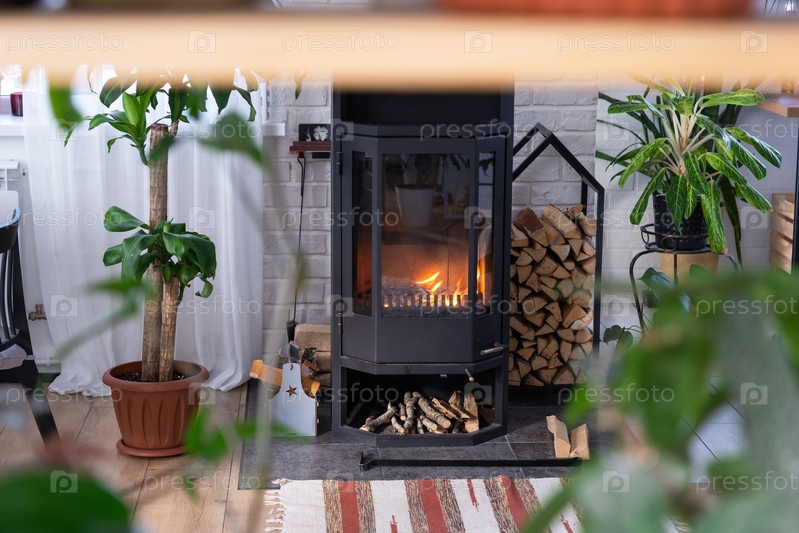 Каминная печь Черный металл Сталь с огнем и дровами в зеленом доме с комнатным растением в цветочной горшке в деревенском доме Уютный домашний очаг в интерьере с растениями в горшках