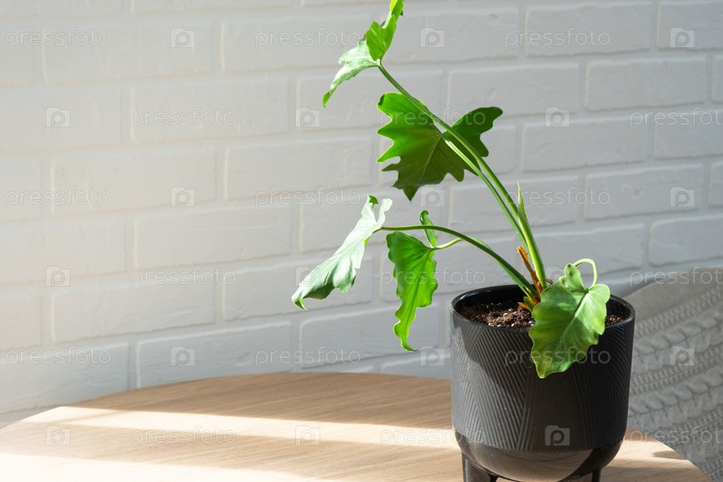 Ростки для выращивания популярного филодендрона ароидного растения в горшке на подставке в интерьере на белой кирпичной стене. Комнатные растения в горшках, зеленый домашний декор, уход и выращивание
