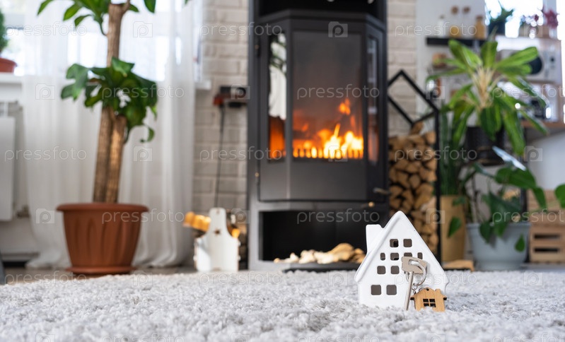 Ключ от дома с брелком на фоне каминной печи с огнем и дровами. Уютный домашний очаг. Строительство, дизайн, проект, переезд в новый дом, ипотека, аренда и покупка недвижимости