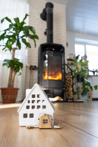 Ключ от дома с брелком на фоне каминной печи с огнем и дровами. Уютный домашний очаг. Строительство, дизайн, проект, переезд в новый дом, ипотека, аренда и покупка недвижимости