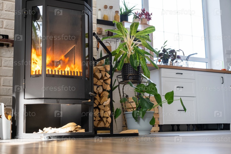 Каминная печь Черный металл Сталь с огнем и дровами в зеленом доме с комнатным растением в цветочной горшке в деревенском доме Уютный домашний очаг в интерьере с растениями в горшках