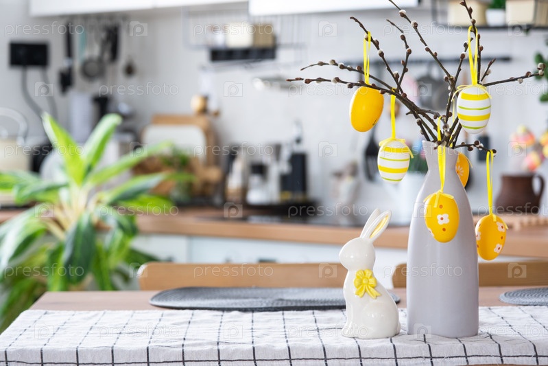 Пасхальное украшение из разноцветных яиц в корзине и кролика на кухонном столе в деревенском стиле. Праздничный интерьер загородного дома