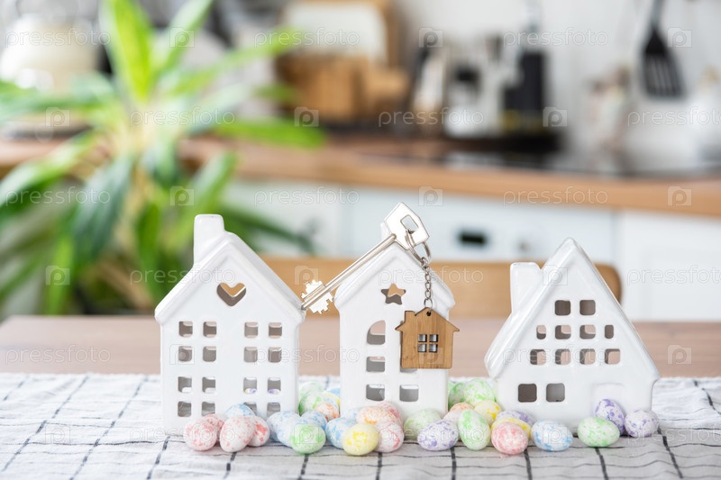 Ключ к дому уютного дома с пасхальным декором с кроликом и яйцами на кухонном столе. Строительство, дизайн, проект, переезд в новый дом, ипотека, страхование, аренда и покупка недвижимости