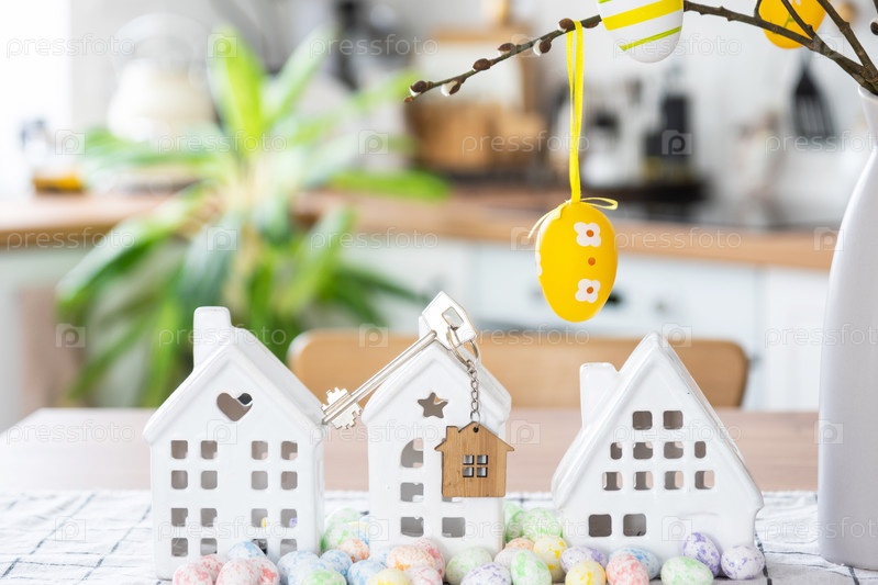 Ключ к дому уютного дома с пасхальным декором с кроликом и яйцами на кухонном столе. Строительство, дизайн, проект, переезд в новый дом, ипотека, страхование, аренда и покупка недвижимости