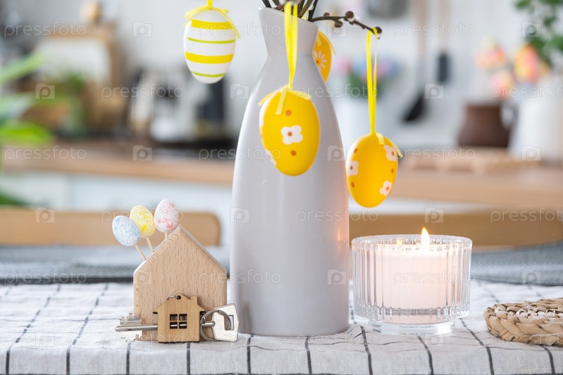 Ключ к дому уютного дома с пасхальным декором с кроликом и яйцами на кухонном столе. Строительство, дизайн, проект, переезд в новый дом, ипотека, страхование, аренда и покупка недвижимости