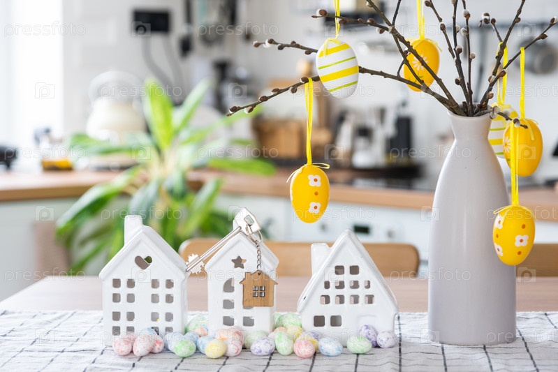 Ключ к дому уютного дома с пасхальным декором с кроликом и яйцами на кухонном столе. Строительство, дизайн, проект, переезд в новый дом, ипотека, страхование, аренда и покупка недвижимости