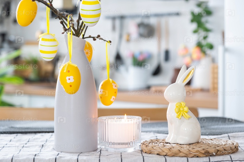 Пасхальное украшение из разноцветных яиц в корзине и кролика на кухонном столе в деревенском стиле. Праздничный интерьер загородного дома