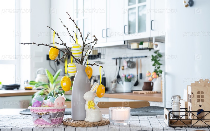 Пасхальное украшение из разноцветных яиц в корзине и кролика на кухонном столе в деревенском стиле. Праздничный интерьер загородного дома