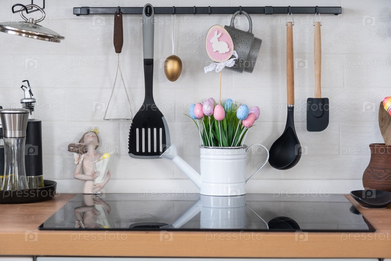 Интерьер кухни и детали декора посуды с пасхальным декором из разноцветных яиц в стиле лофт. Праздничный интерьер загородного дома