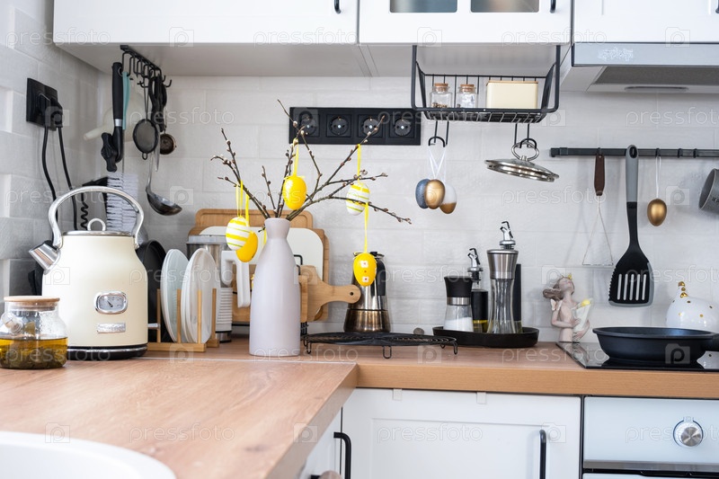 Интерьер кухни и детали декора посуды с пасхальным декором из разноцветных яиц в стиле лофт. Праздничный интерьер загородного дома
