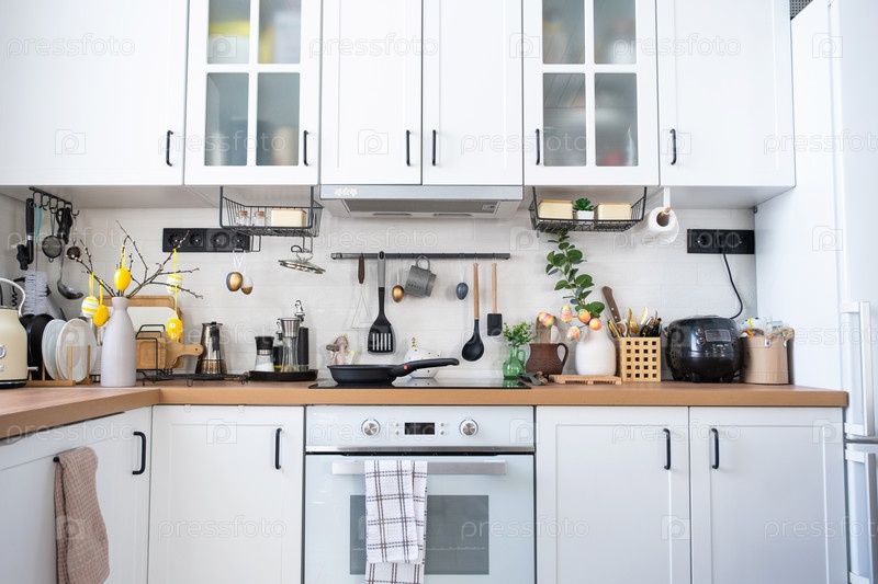 Интерьер кухни и детали декора посуды с пасхальным декором из разноцветных яиц в стиле лофт. Праздничный интерьер загородного дома