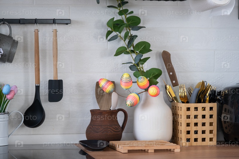 Интерьер кухни и детали декора посуды с пасхальным декором из разноцветных яиц в стиле лофт. Праздничный интерьер загородного дома