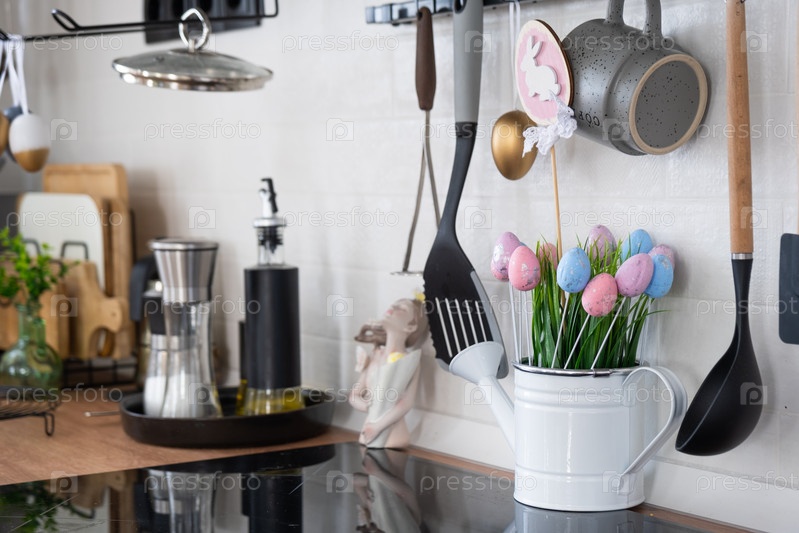 Интерьер кухни и детали декора посуды с пасхальным декором из разноцветных яиц в стиле лофт. Праздничный интерьер загородного дома