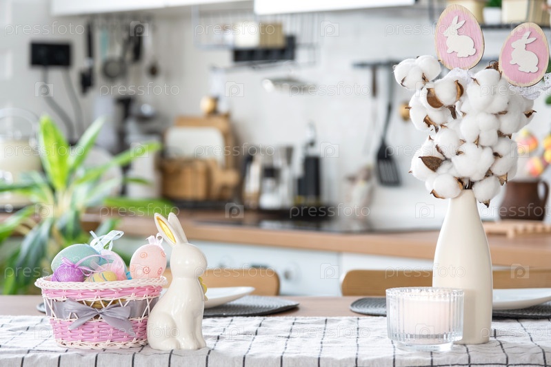 Пасхальное украшение из разноцветных яиц в корзине и кролика на кухонном столе в деревенском стиле. Праздничный интерьер загородного дома