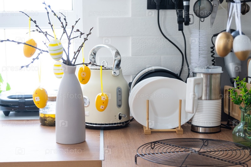 Интерьер кухни и детали декора посуды с пасхальным декором из разноцветных яиц в стиле лофт. Праздничный интерьер загородного дома