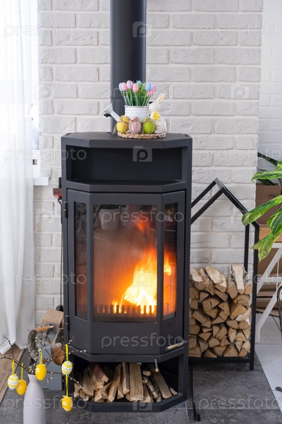 Пасхальный декор возле каминной печи с огнем и дровами. Уютный домашний очаг в интерьере с планами в горшках, красочными пасхальными яйцами, пасхальным кроликом и букетом. Весна в загородном доме