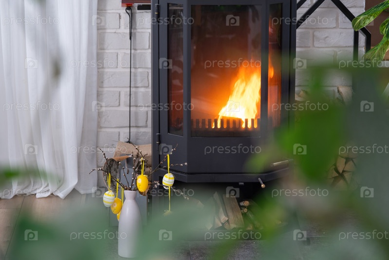 Пасхальный декор возле каминной печи с огнем и дровами. Уютный домашний очаг в интерьере с планами в горшках, красочными пасхальными яйцами, пасхальным кроликом и букетом. Весна в загородном доме