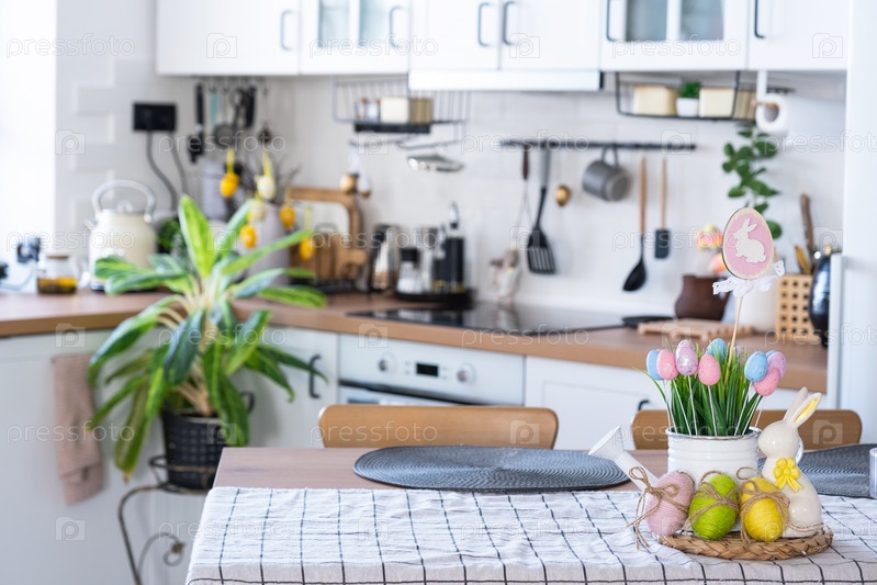Пасхальное украшение из разноцветных яиц в корзине и кролика на кухонном столе в деревенском стиле. Праздничный интерьер загородного дома