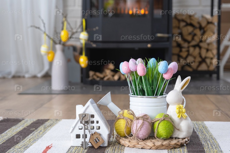Ключ от дома возле каминной печи с огнем и дровами. Уютный домашний очаг с пасхальным декором, разноцветными яйцами в корзине и кроликом. Строительство, переезд, ипотека, аренда и покупка недвижимости, страхование