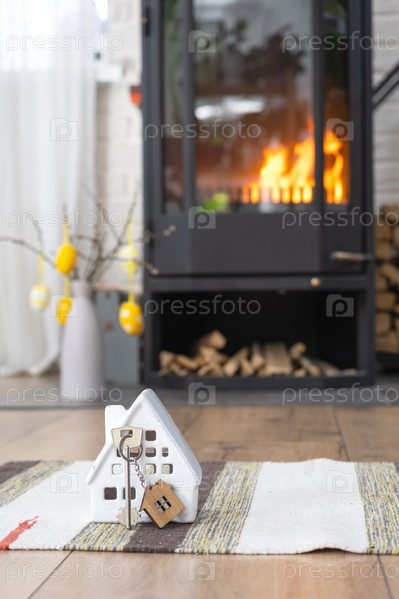 Ключ от дома возле каминной печи с огнем и дровами. Уютный домашний очаг с пасхальным декором, разноцветными яйцами в корзине и кроликом. Строительство, переезд, ипотека, аренда и покупка недвижимости, страхование