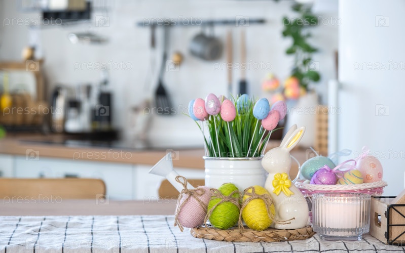 Пасхальное украшение из разноцветных яиц в корзине и кролика на кухонном столе в деревенском стиле. Праздничный интерьер загородного дома