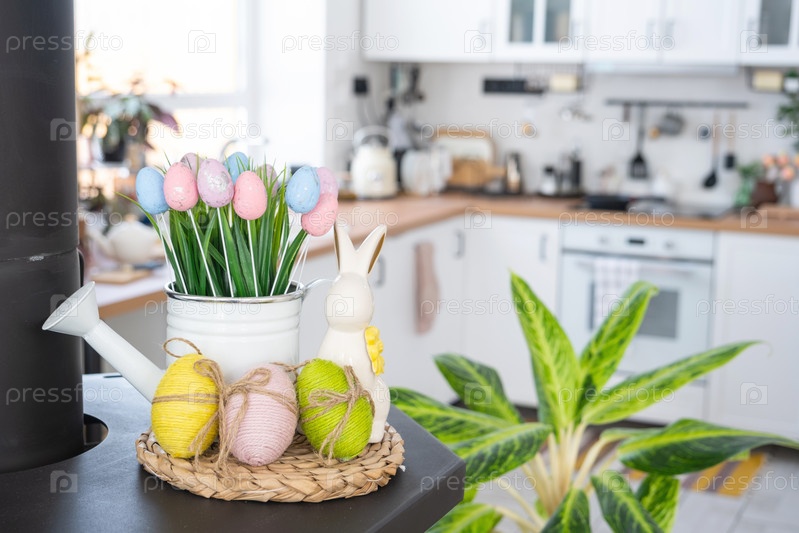 Интерьер кухни и детали декора посуды с пасхальным декором из разноцветных яиц в стиле лофт. Праздничный интерьер загородного дома