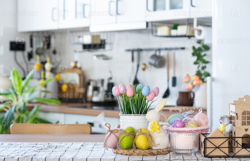 Пасхальное украшение из разноцветных яиц в корзине и кролика на кухонном столе в деревенском стиле. Праздничный интерьер загородного дома