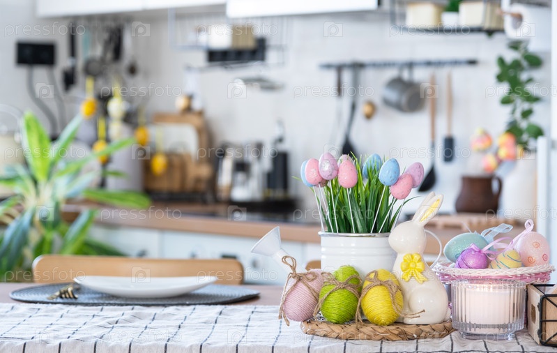 Пасхальное украшение из разноцветных яиц в корзине и кролика на кухонном столе в деревенском стиле. Праздничный интерьер загородного дома