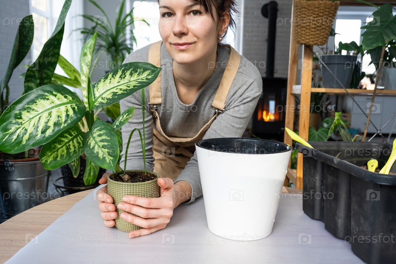 Пересадка домашнего растения Диффенбахия Тропик Сноу в новый горшок в домашних условиях в двойной горшок с автоматическим поливом. Уход за растением в горшке, крупный план