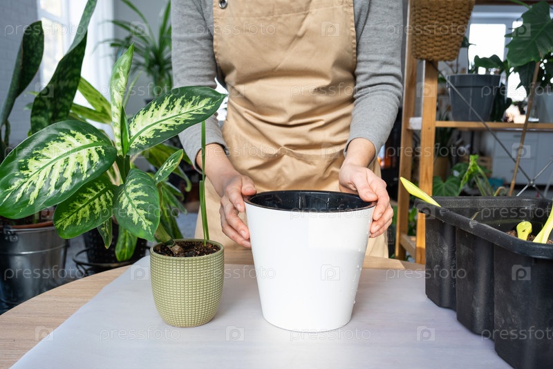 Пересадка домашнего растения Диффенбахия Тропик Сноу в новый горшок в домашних условиях в двойной горшок с автоматическим поливом. Уход за растением в горшке, крупный план