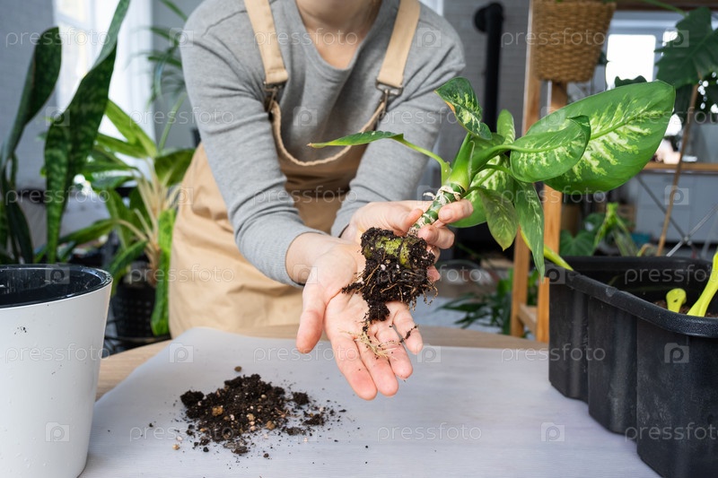 Земляной ком домашнего горшечного растения обвит корнями, растение переросло горшок. Необходимость пересадки растения. Пересадка и уход за домашним растением, корневищные, корневые гнили