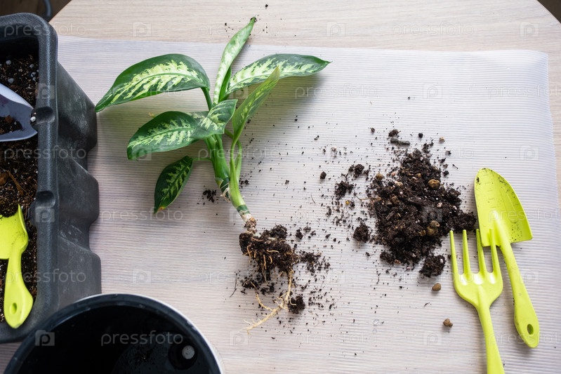 Пересадка домашнего растения Диффенбахия Тропик Сноу в новый горшок в домашних условиях в двойной горшок с автоматическим поливом. Уход за растением в горшке, крупный план