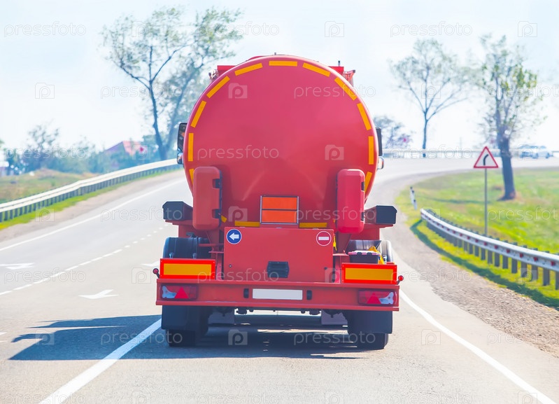 Бензовоз движется по проселочной дороге. Вид сзади