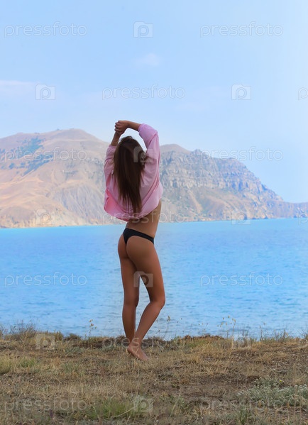 Кавказская девушка поднимает руки вверх на берегу моря