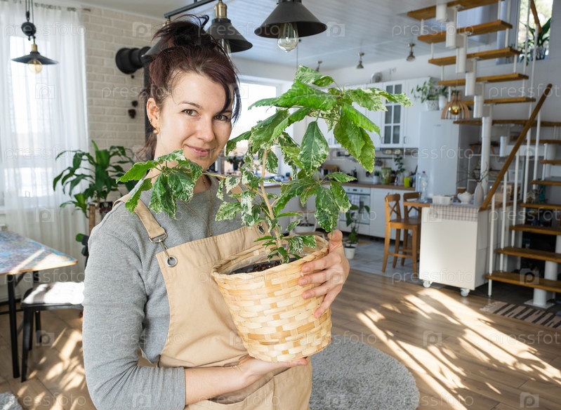 Счастливая женщина в зеленом доме с растением в горшке в руках улыбается, ухаживает за цветком. Интерьер уютного экологичного дома, каминная печь, хобби по выращиванию и разведению комнатных растений