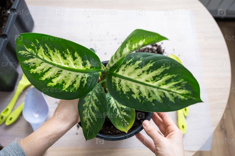 Пересадка домашнего растения Диффенбахия Тропик Сноу в новый горшок в домашних условиях в двойной горшок с автоматическим поливом. Уход за растением в горшке, крупный план