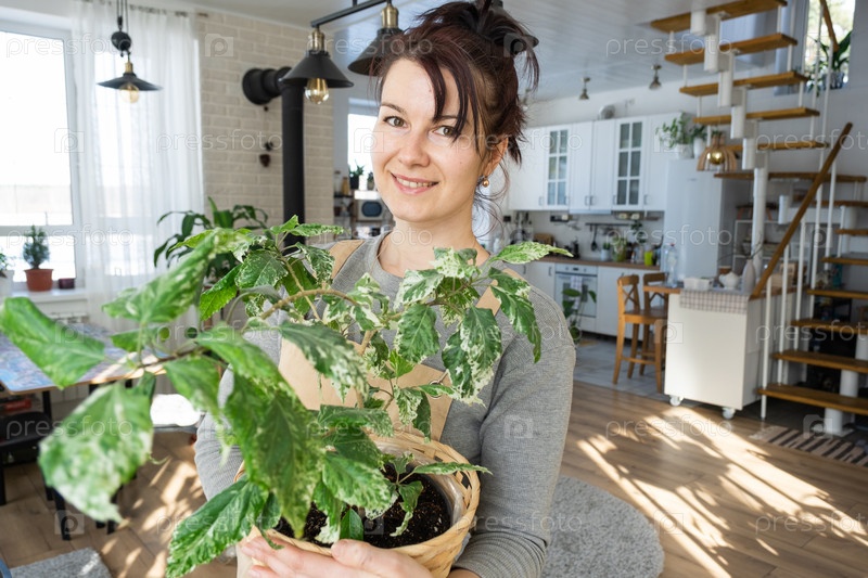 Счастливая женщина в зеленом доме с растением в горшке в руках улыбается, ухаживает за цветком. Интерьер уютного экологичного дома, каминная печь, хобби по выращиванию и разведению комнатных растений