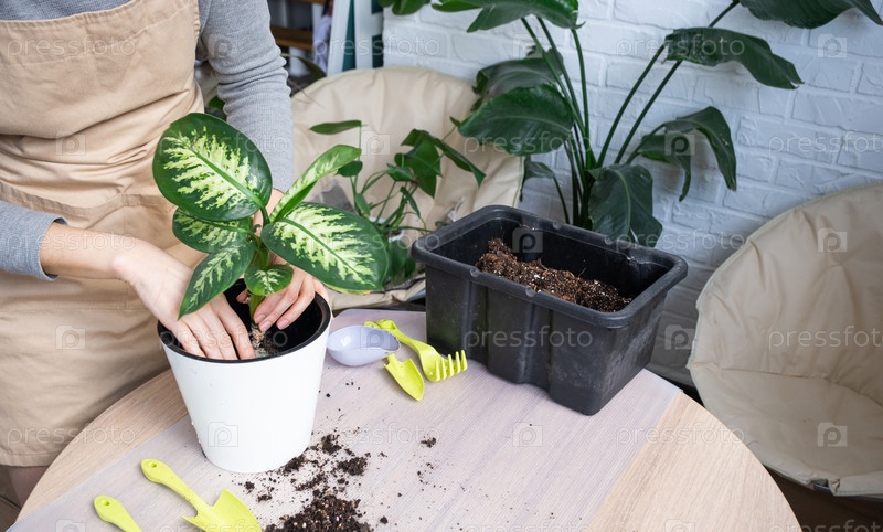 Пересадка домашнего растения Диффенбахия Тропик Сноу в новый горшок в домашних условиях в двойной горшок с автоматическим поливом. Уход за растением в горшке, крупный план