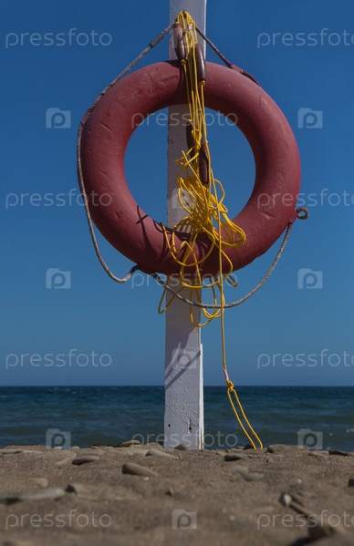 Красный спасательный круг на шесте у берега моря