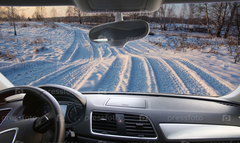 Вид автомобиля на зимний березовый лес